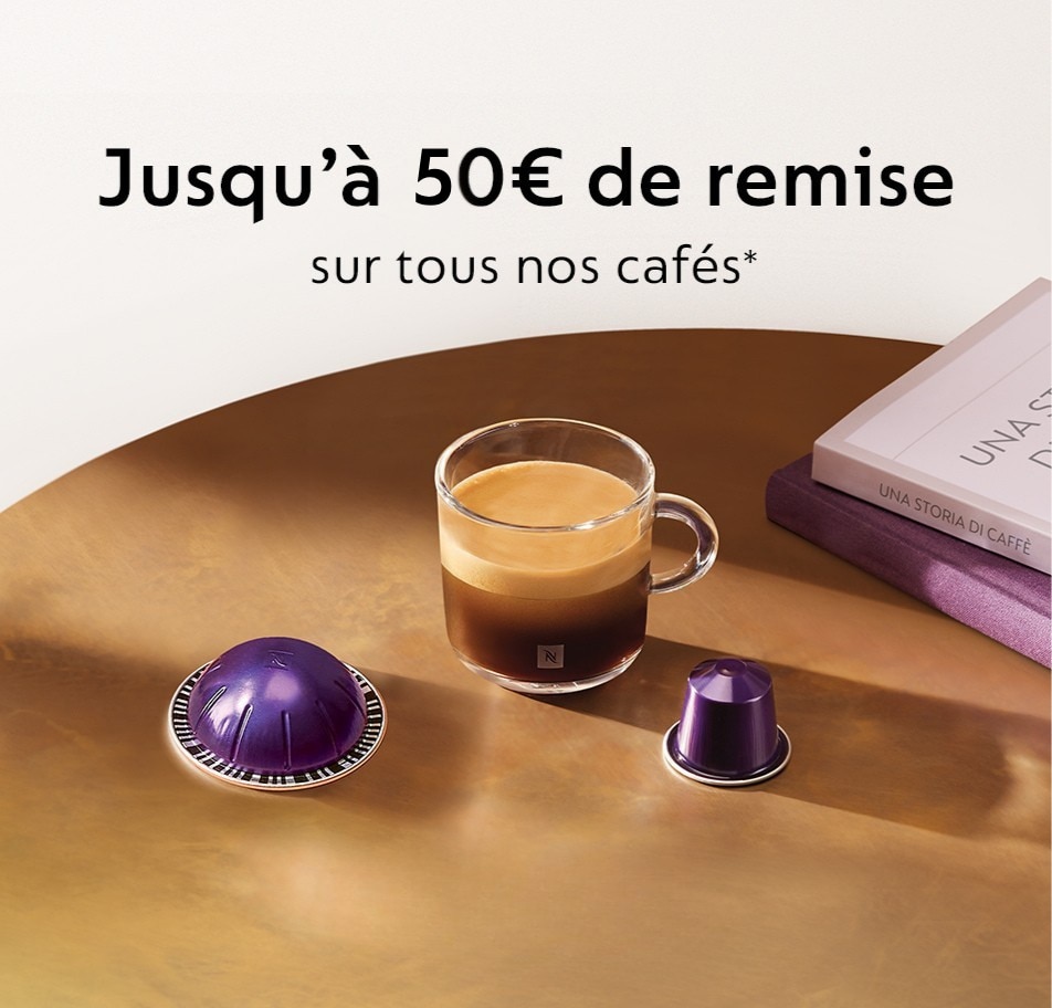 ou bénéficiez d’une remise immédiate de 15€ sur le montant de votre commande dès 150 capsules de la gamme Original et/ou Vertuo achetées ; ou bénéficiez d’une remise immédiate de 30€ sur le montant de votre commande dès 250 capsules de la gamme Original et/ou Vertuo achetées; ou bénéficiez d’une remise immédiate de 50€ sur le montant de votre commande dès 400 capsules de la gamme Original et/ou Vertuo